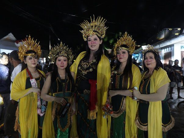 Dengan busana megah berbalut nuansa hijau keemasan serta mahkota besar yang berkilauan, Flo tampil bagai ratu di tengah-tengah rombongan karnaval. Kehadirannya seketika menjadi pusat sorotan, baik dari penonton maupun kamera warga yang berebut mengabadikan momen langka tersebut.