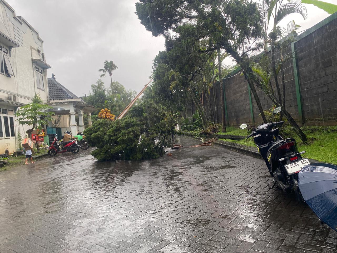 Beberapa warga terlihat membantu mengamankan area sekitar sambil menunggu proses penanganan lebih lanjut. Jalan sempat tidak bisa dilalui kendaraan karena tertutup batang dan ranting pohon. Meski demikian, tidak dilaporkan adanya kerusakan bangunan yang signifikan.