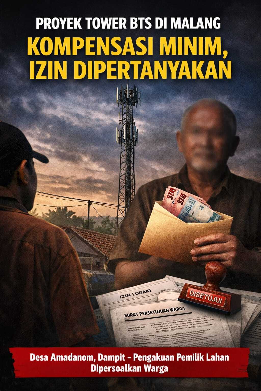 Menara itu berdiri menjulang di tengah permukiman RT 01 RW 02 Desa Amadanom, Kecamatan Dampit, Kabupaten Malang. Bagi warga sekitar, kehadirannya masih menyisakan tanda tanya—tentang proses yang tidak mereka pahami sejak awal.