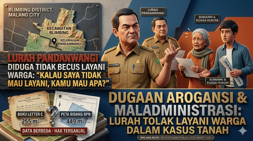 MALANG – Dugaan buruknya pelayanan publik di Kelurahan Pandanwangi, Kecamatan Blimbing, Kota Malang menjadi sorotan. Seorang warga, Sumarni, mengaku mengalami kesulitan dalam mengurus administrasi tanah setelah diduga mendapat penolakan langsung dari Lurah Pandanwangi.