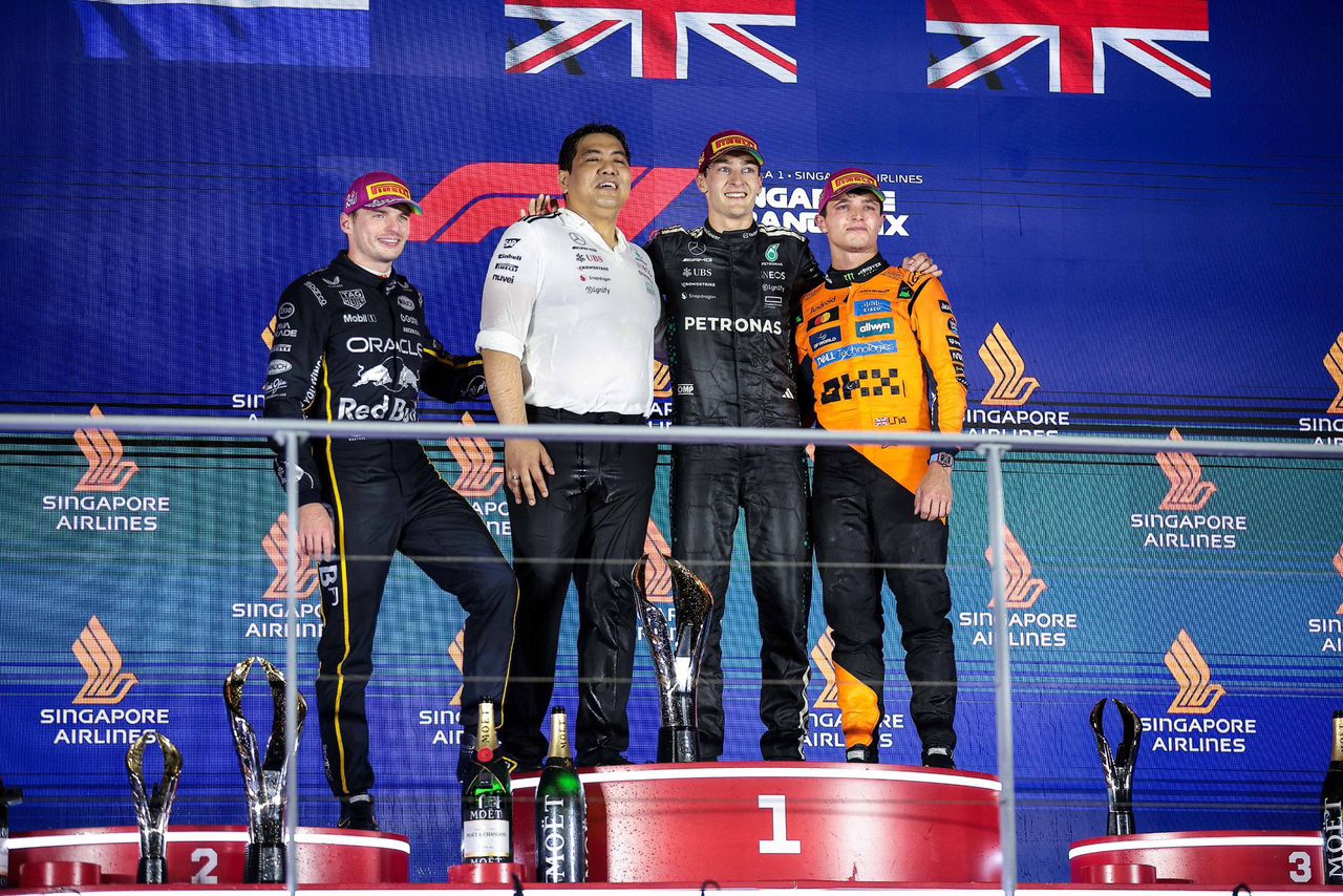 George Russell mengemudikan Mercedes dengan kontrol penuh dari pole sampai bendera finish untuk memenangi Grand Prix Singapura, menandai kemenangan penting pada salah satu sirkuit paling menuntut di kalender. Di belakangnya Max Verstappen dan Lando Norris menutup podium, sementara McLaren merayakan gelar konstruktor yang menempatkan mereka kembali di jajaran elite tim-tim pemenang.